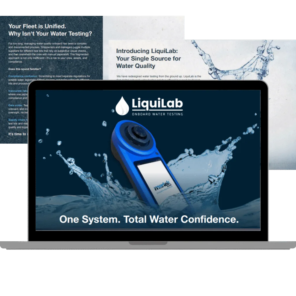 Water quality management across a global fleet is no small task. From suspect bunkering locations and inaccessible test points to long lab turnaround times, uncertainty can quickly lead to costly downtime, crew sickness, or compliance risks. LiquiLab simplifies marine water testing, giving you control of your vessel’s water systems – potable, ballast, boiler/cooling, sewage and legionella. With LiquiLab in your toolkit, you’ll be inspection-ready anywhere in the world.